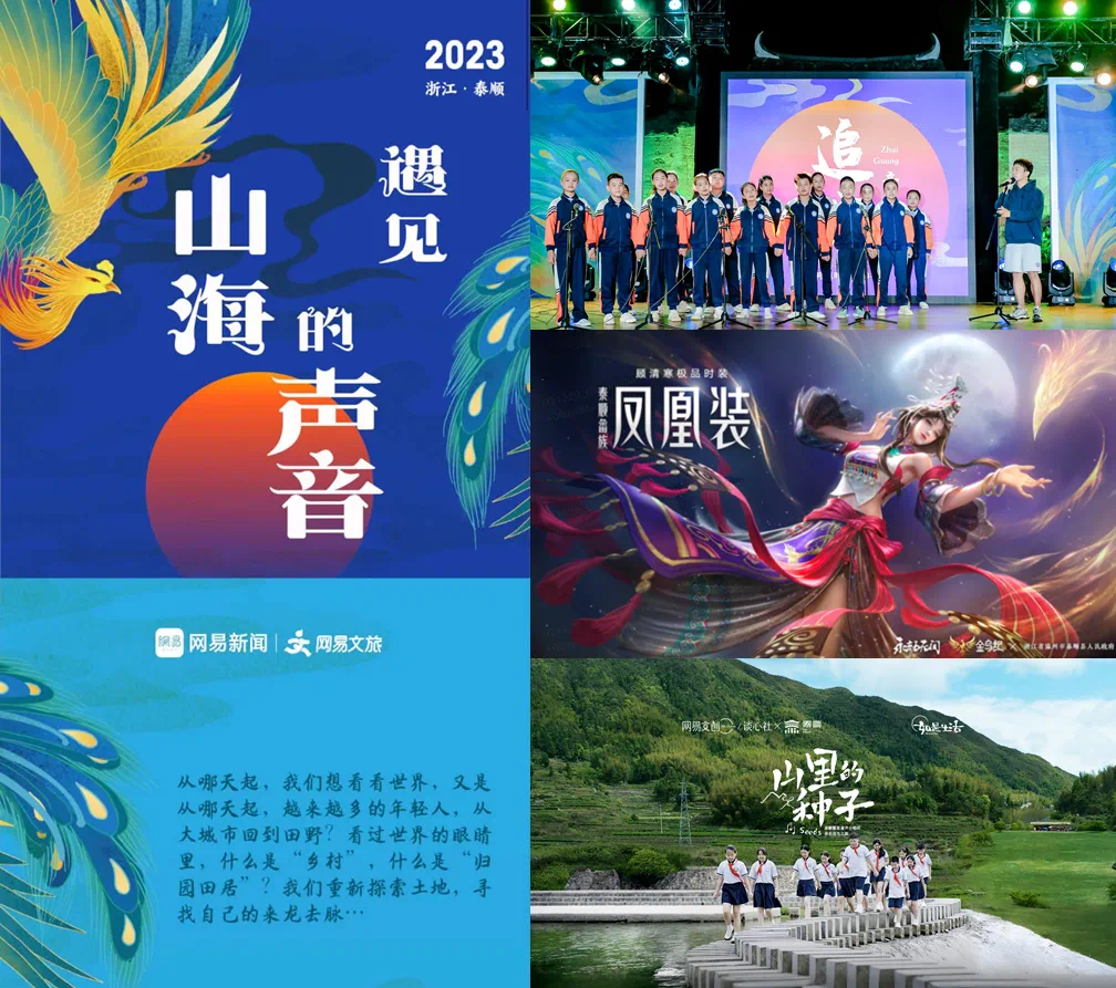 首先,联合网易云音乐、网易游戏、网易严选发起“网络文化寻根之旅”,组织内容团队前往泰顺“搞创作”,挖掘地方文化,树立泰顺文旅品牌,换新泰顺文旅产品;然后,发起“山里的种子公益行动”,通过内容电商、教育公益“传递爱”,帮助泰顺的企业、学校提升数字化水平,实现共同富裕的成果转化;最后,为地方政府架构起完整的传播体系,网易文创头部IP贯穿全年的G2C互动,帮助泰顺在互联网世界“找知音”,让更多人知道泰顺、了解泰顺、讨论泰顺。