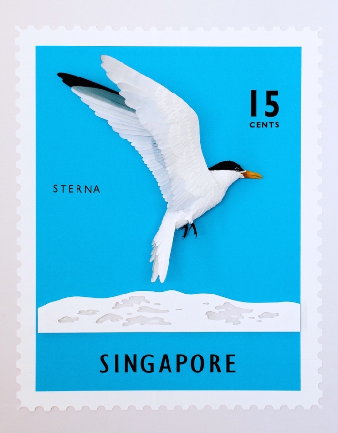 在赞美过埃雷拉的鸟儿和蝴蝶雕塑后,我们再来认识一下她在过去几年创作的另一组作品——真实生态环境下的鸟类主题邮票。这组作品将精美的纸雕艺术做成了世界各地的“大码”邮票,还有鲜花和文字来点缀设计。