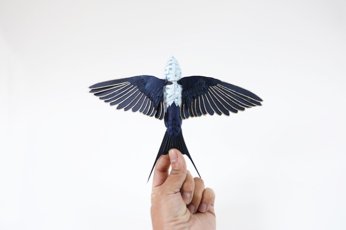 通过简单而日常的材料,艺术家戴安娜·贝尔特伦·埃雷拉(Diana Beltran Herrera)创造出了活灵活现的生物。她将纸、线和木头变为了栩栩如生的鸟儿,每一个细节都令人难以置信。这些细致的纸艺作品全部由手工裁剪,模仿鸟儿层层细分的羽毛,构造出美丽的羽衣。虽然这个过程无趣又重复,埃雷拉的作品却活灵活现、展翅欲飞。