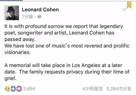 “我们怀着沉痛的悲伤宣布这一消息:传奇的诗人、歌手、艺术家莱昂纳德·科恩已经离开我们。我们永远失去了一位音乐界最值得尊敬、最成就卓越的伟大愿景家。”