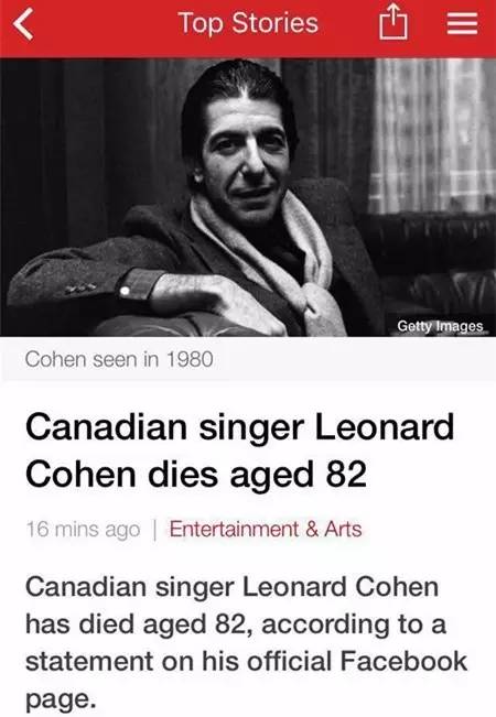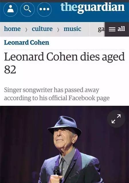据科恩本人的官方Facebook消息,北京时间11月11日上午,加拿大著名歌手、诗人莱昂纳德·科恩去世,享年82岁。