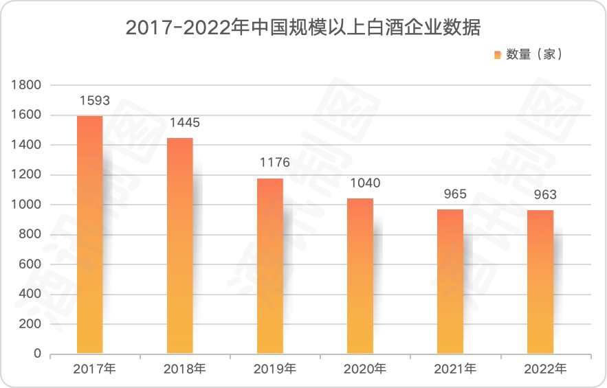 国家统计局数据显示,2023年1月-12月,规模以上企业白酒(折65度,商品量)产量449.2万千升,同比减少2.8%。同时,中国白酒企业的数量整体呈下降趋势。2017年,中国规模以上白酒企业1593家,到2022年,仅剩963家。