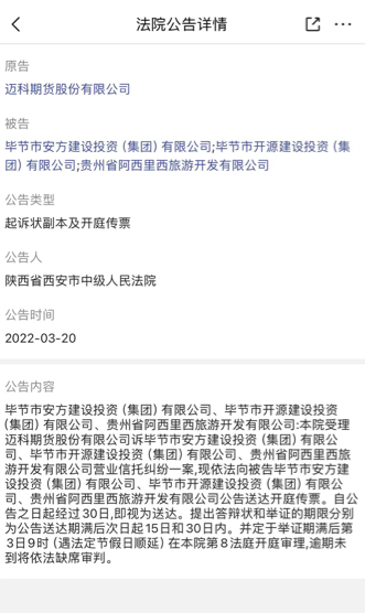 逾期后,迈科期货代表资管计划提起诉讼,将毕节安方建设、贵州省阿西里西旅游开发有限公司、毕节开源告上法院。