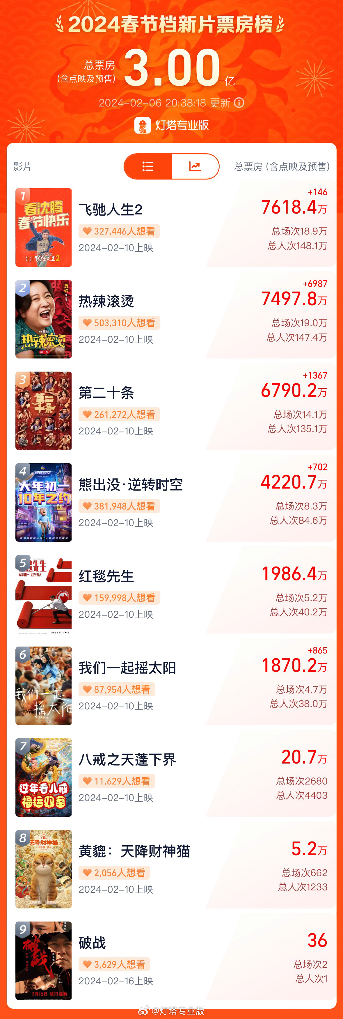 据灯塔专业版,2024春节档新片预售总票房突破3亿。《飞驰人生2》《热辣滚烫》《第二十条》暂列春节档新片预售票房前三位。