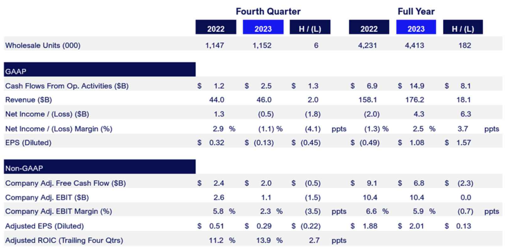 当地时间2月6日,美国福特公司发布2023年财务业绩。2023年第四季度营收为460亿美元,同比增长4%;净亏损5.26亿美元,原因是与重新计量养老金和其他退休员工福利(OPEB)计划相关的税前非现金会计亏损17亿美元。2023年全年营收为1762亿美元,同比增长11%;净利润为43亿美元,上年同期为净亏损20亿美元。