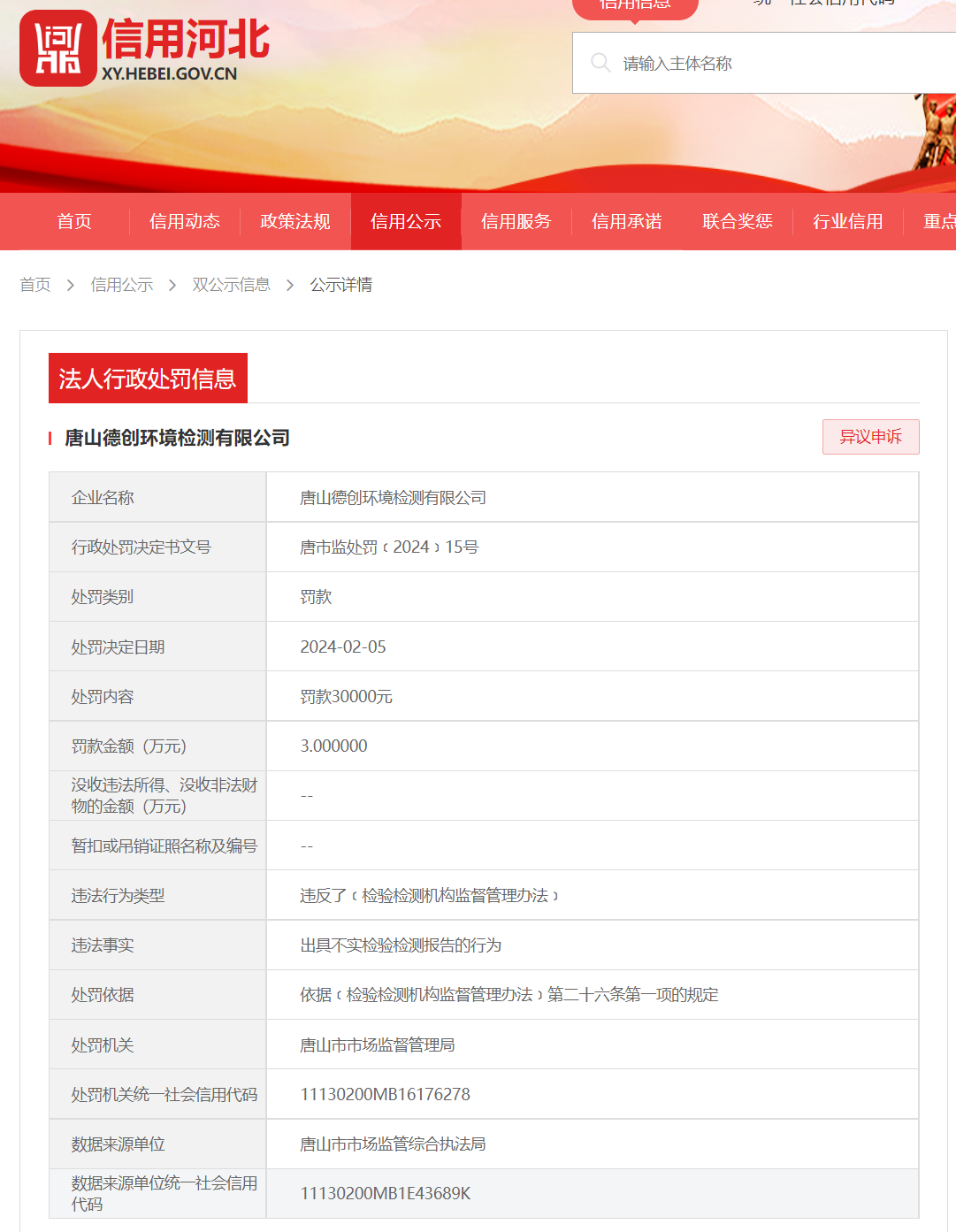 据信用河北门户网站显示,唐山德创环境检测有限公司出具不实检验检测报告,违反了《检验检测机构监督管理办法》。唐山市市场监督管理局依据《检验检测机构监督管理办法》第二十六条第一项的规定,对该公司处罚款30000元。