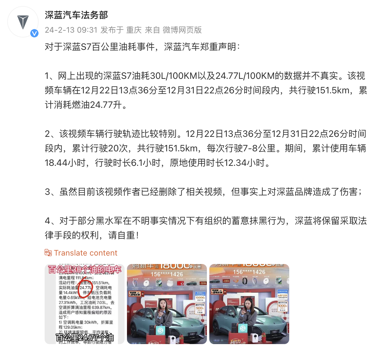 据@深蓝汽车法务部 消息,2月13日,对于深蓝S7百公里油耗事件,深蓝汽车发布声明称,网上出现的深蓝S7油耗30L/100KM以及24.77L/100KM的数据并不真实。该视频车辆在12月22日13点36分至12月31日22点26分时间段内,共行驶151.5km,累计消耗燃油24.77升。该视频车辆行驶轨迹比较特别。12月22日13点36分至12月31日22点26分时间段内,累计行驶20次,共行驶151.5km,每次行驶7-8公里。期间,累计使用车辆18.44小时,行驶时长6.1小时,原地使用时长12.34小时。