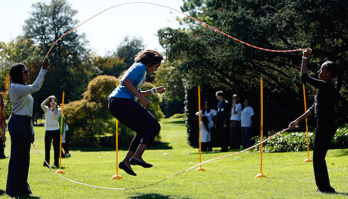 在公共场合,她与孩子们一起跳绳、转呼啦圈。出席活动时,她用爽朗的笑声拉近与人的距离。多年来,她严于律己,努力用实际行动推动社会的改变。为解决美国儿童的肥胖问题,米歇尔在2010年发起了“动起来”(Let’s Move)的健康计划,呼吁培养健康的饮食习惯和积极的生活方式。