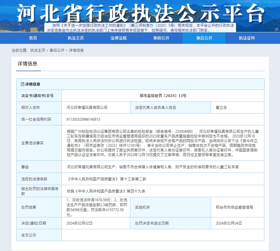 据河北省行政执法公示平台显示,河北好莱福玩具有限公司生产、销售不符合保障人体健康和人身、财产安全的标准和要求的儿童三轮车案,违反《中华人民共和国产品质量法》 第十三条第二款,邢台市市场监督管理局依据《中华人民共和国产品质量法》第四十九条对其作出如下处罚:1、没收违法所得1676.59元;2、处违法生产产品货值金额2.3倍罚款,即罚款54096元整;罚没款共计55772.59元。