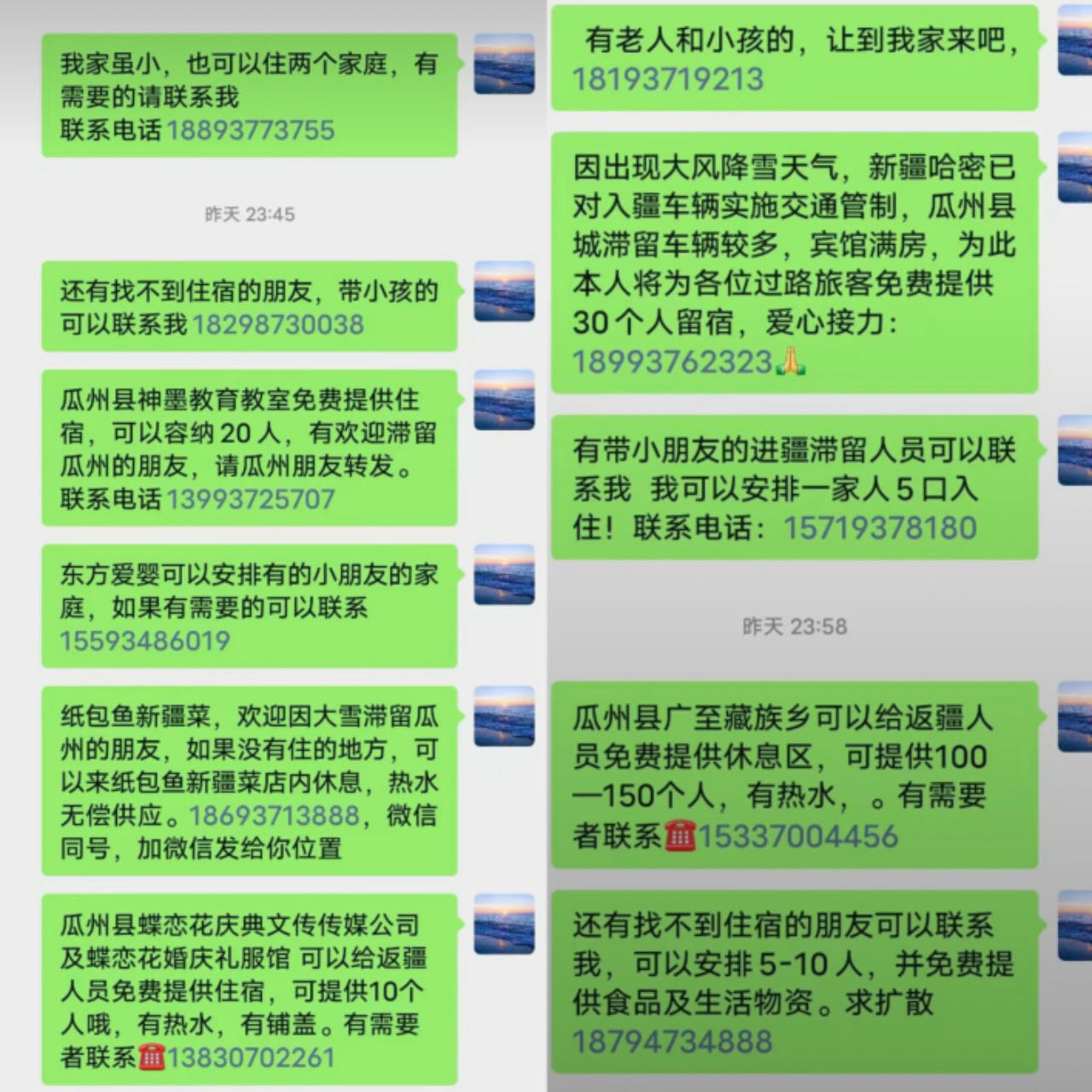 界面新闻在线上订房平台检索发现,瓜州县绝大部分宾馆的房间已经被订完。一位宾馆前台告诉界面新闻,2月17日早上开始有大量客人入住,“都是进疆的人”,目前没有空房,入住的客人仍在续房。另一家宾馆工作人员表示,客人可以来宾馆的楼道打地铺,但是需要自带被褥,宾馆提供免费热水。一张网络截图显示,另有个人家庭、企业等面向滞留人员提供住宿。