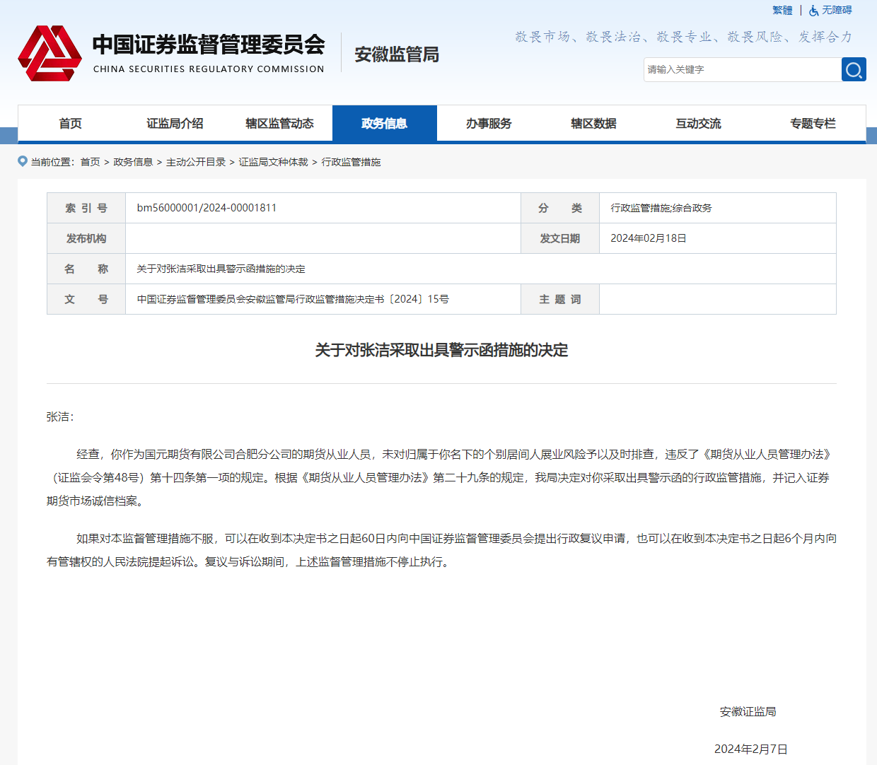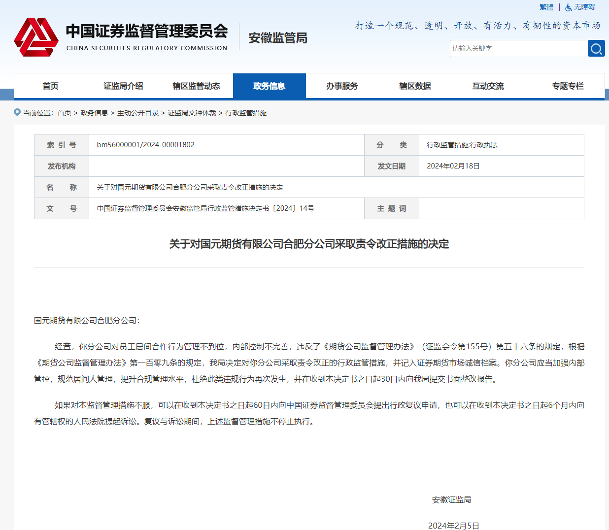 据中国证券监督管理委员会安徽监管局官网显示,近日,安徽证监局分别对国元期货有限公司合肥分公司以及该公司期货从业人员张洁采取责令改正、出具警示函措施。