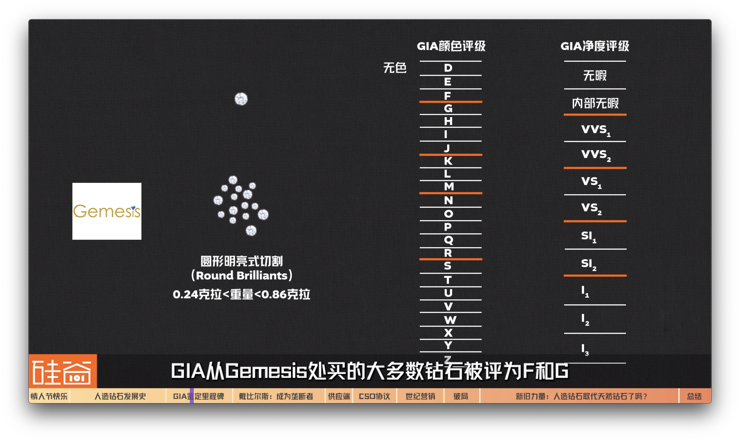 而美国宝石研究院GIA的研究人员嗅到了市场的风声,立马从Gemesis公司购买了16 颗钻石,开始进行鉴定。他们发现,其中15颗钻石采取了圆形明亮式(round brilliants )切割,重量从 0.24 克拉到0.86 克拉不等,大多数接近无色。在GIA对钻石的4C评级上,颜色评级从D到Z,D是最接近无色的,GIA从Gemesis处买的大多数钻石被评为F和G,相当不错的成色了,其中三颗被评为I和J,而最大的一颗0.9克拉的方形切割(rectangle cut)钻石被评为L级。而在净度上,基本所有买来的钻石都在较高级VVS或VS的级别,其中有一颗达到了“内部无暇”的顶级净度。