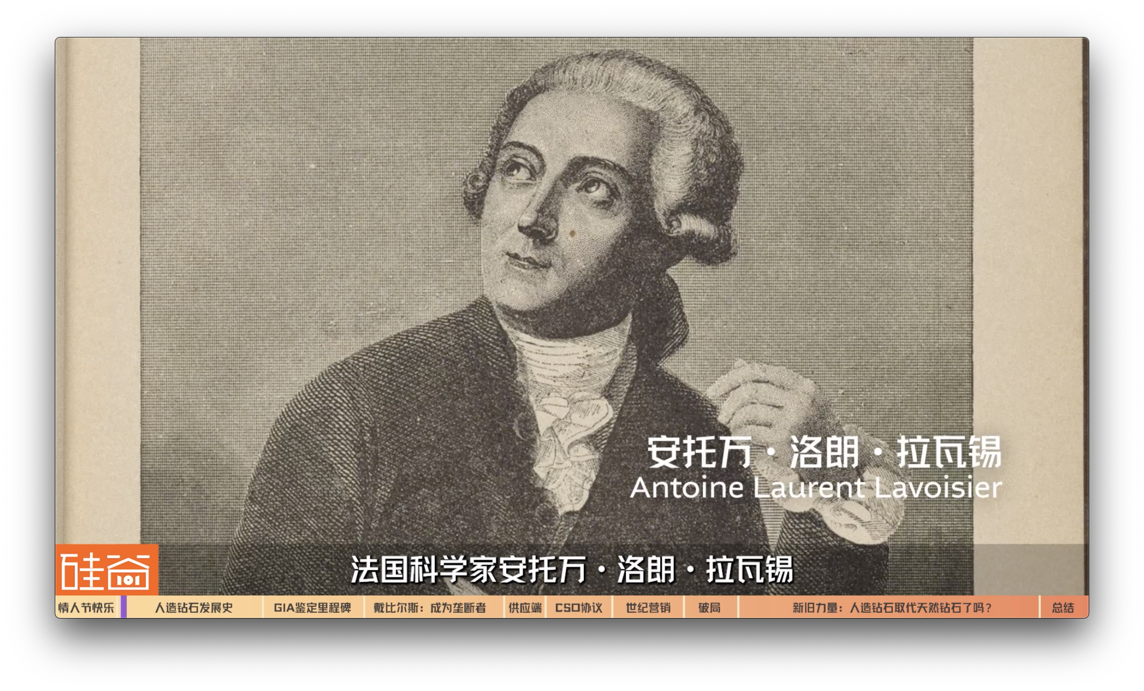 钻石在人类社会中被视为瑰宝和珍贵的象征已经数千年,但直到1772,被称为“现代化学之父”的法国科学家安托万·洛朗·拉瓦锡 (Antoine Laurent Lavoisier)将一颗钻石放入充满氧气的密闭罐中,用巨大的放大镜聚焦太阳光线将它燃烧,结果发现钻石和碳一样,每克材料会形成相同量的二氧化碳,由此人类意识到,钻石是由碳元素组成的矿物。