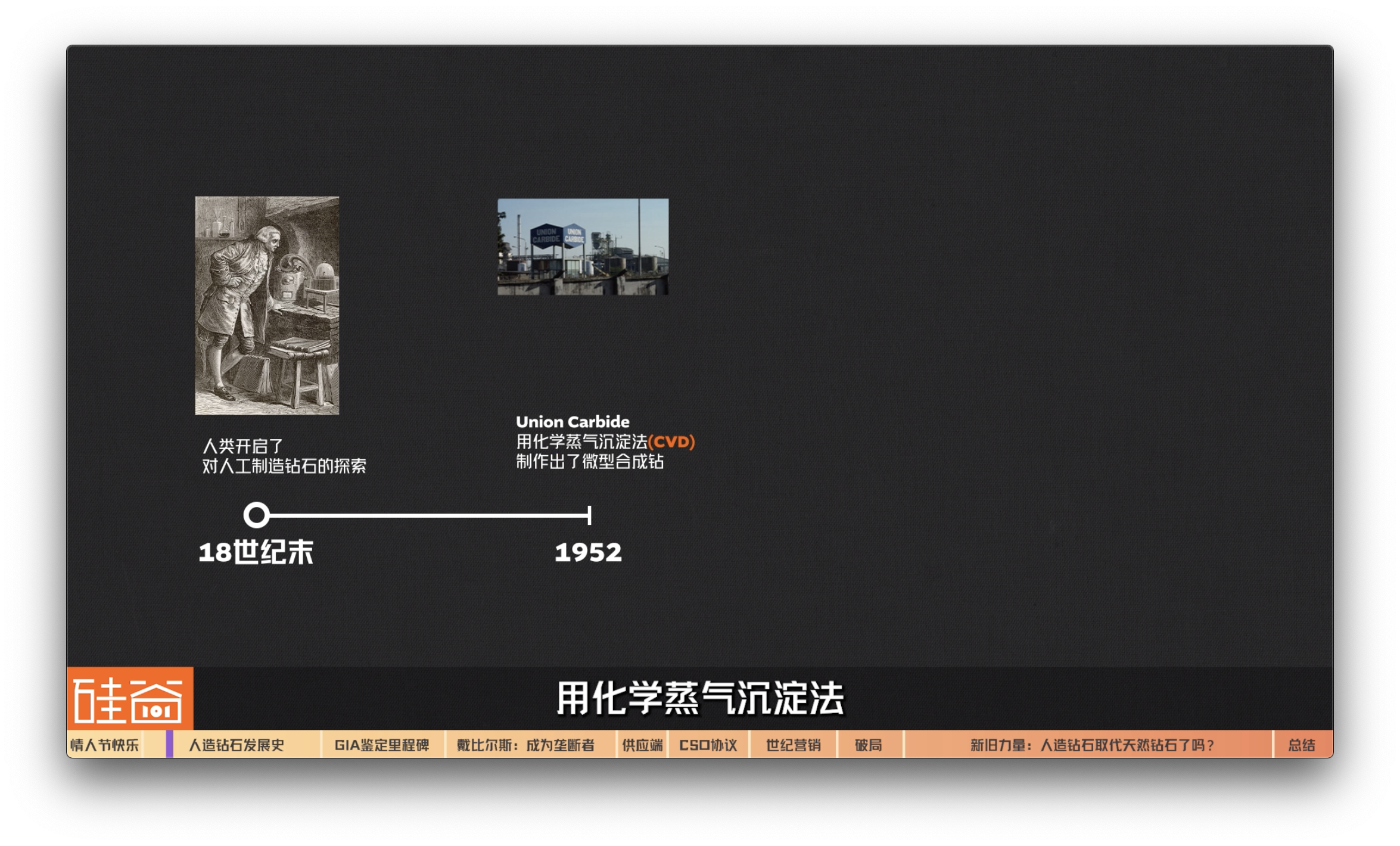 1952 年,美国石油化工公司Union Carbide用化学蒸气沉淀法chemical vapour deposition,简称CVD,在低压及相对较低的温度条件下制作出了微型合成钻石。