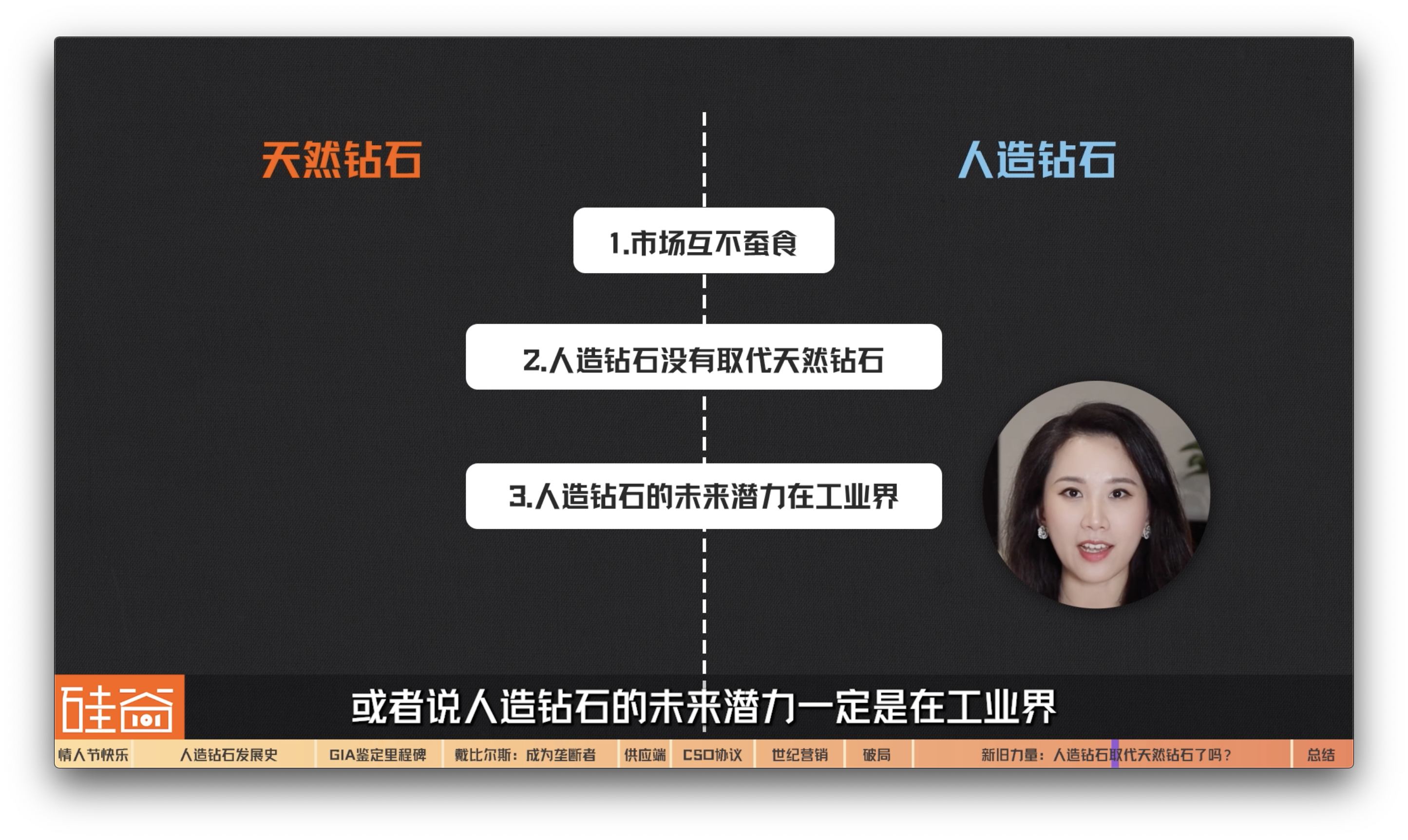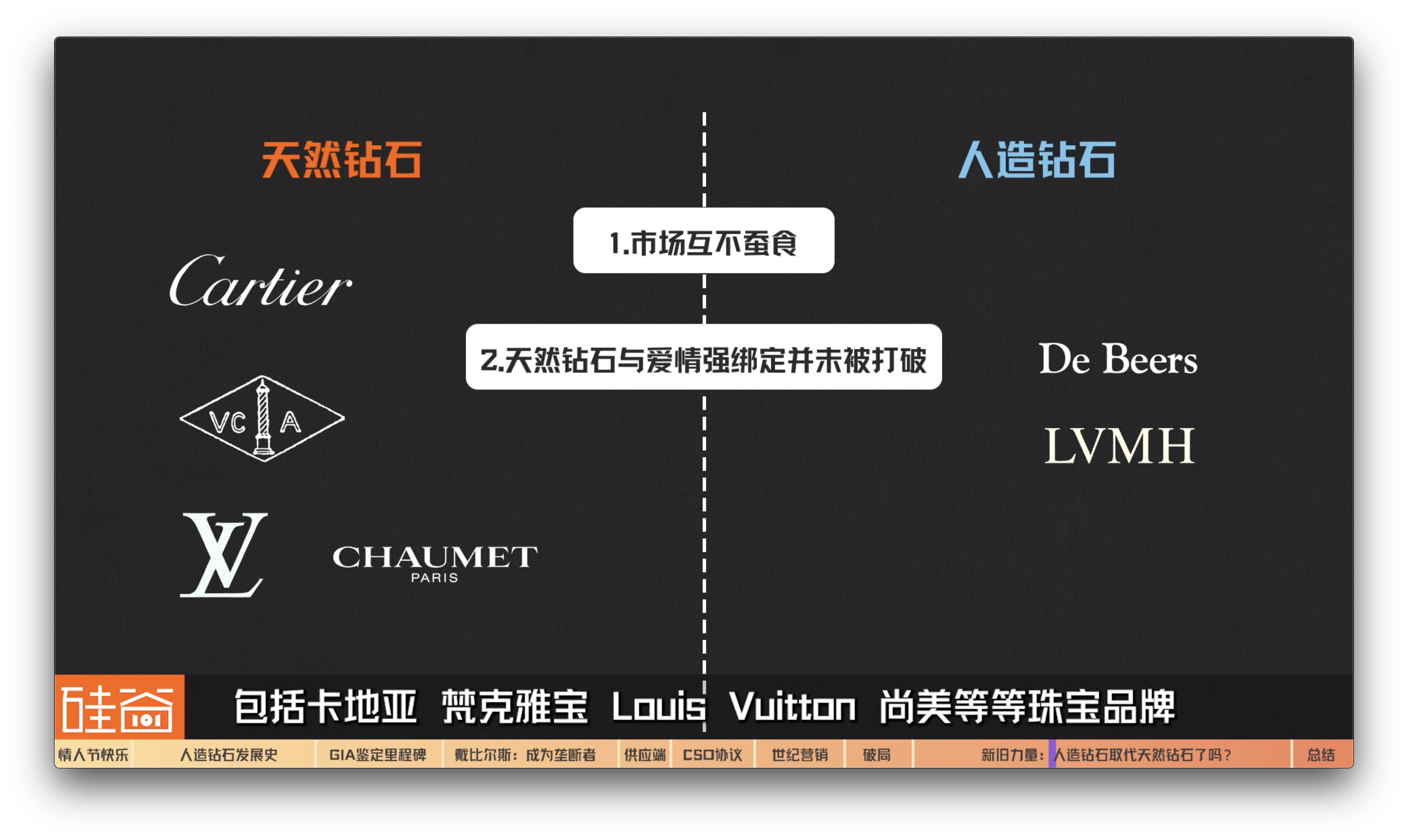 1)人造钻石和天然钻石是两个不同的市场,可能有重叠,但目前主流消费人群并没有重叠太多;