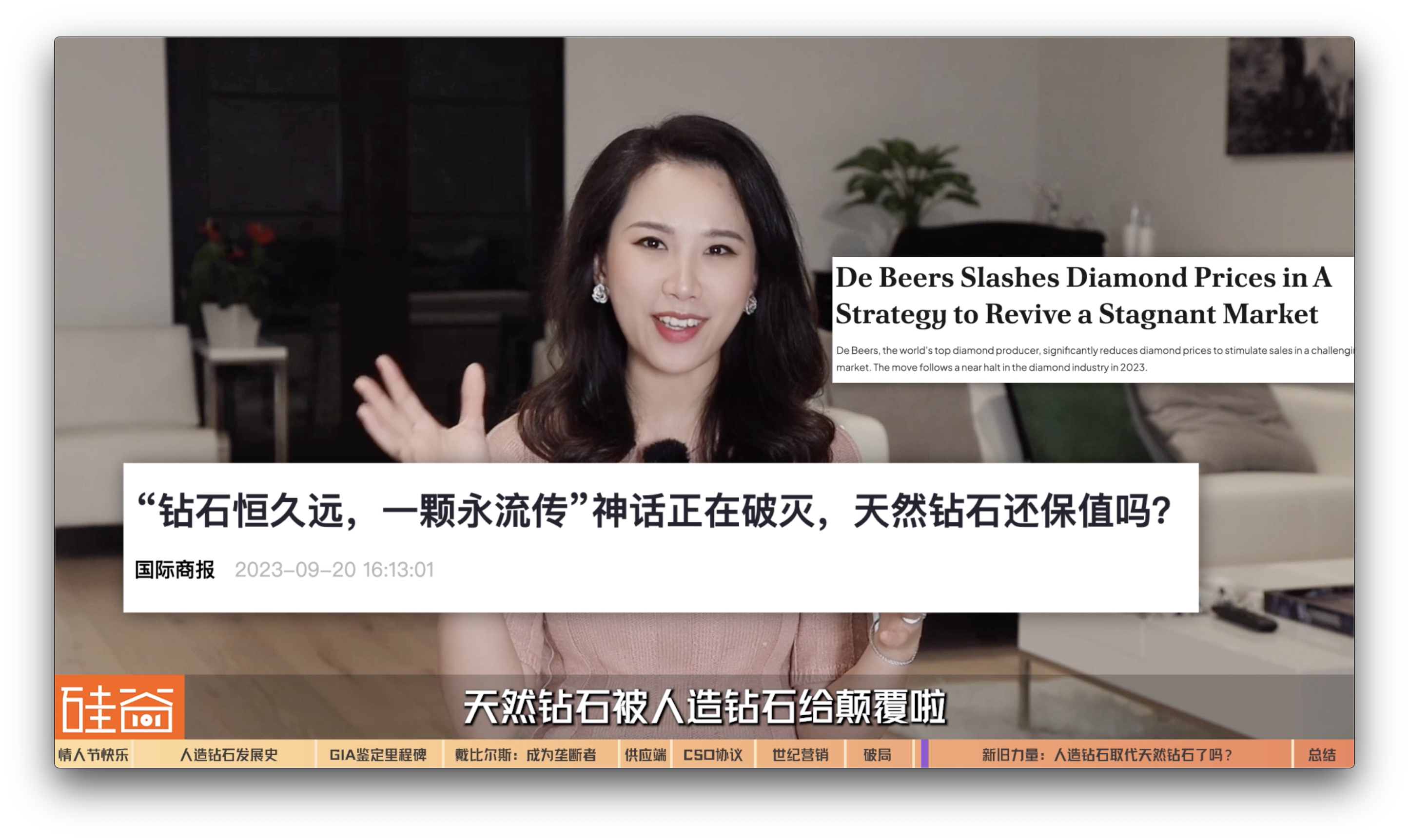 此外,天然钻石因为有奢侈品牌的背书、整个4C定价体系和GIA证书的鉴定,让消费者认为真实性、品质和过程都更为透明,但人造钻石市场依然鱼龙混杂、鉴定生态不完善,也使得一些消费者不敢下手,反而更愿意去买更有保障的天然钻石。