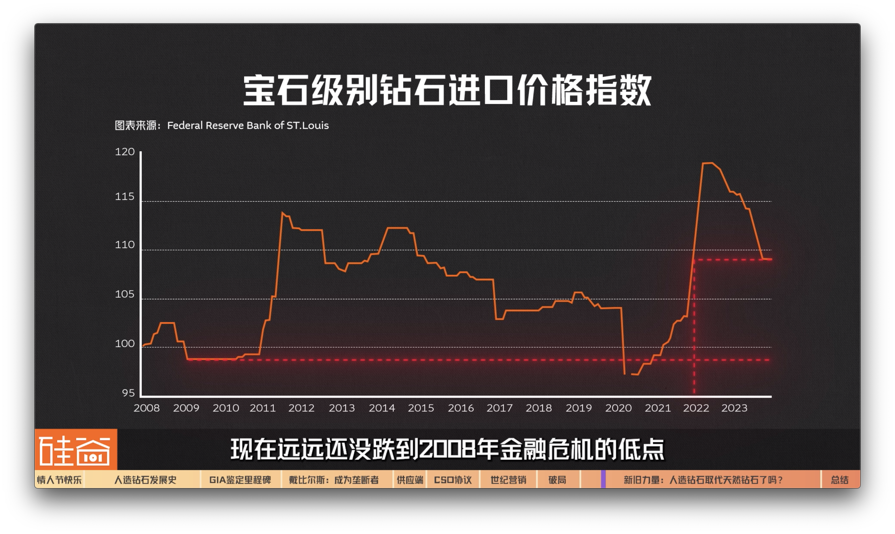 但是我们再回到圣路易斯联储的这张宝石级别钻石进口价格指数上,然后把时间轴拉长一点,会发现,目前的钻石价格的跌幅不过是跌到了2021年的12月。如果再拉长会发现,现在远远还没跌到2008年金融危机的低点。我们对此也采访了追踪钻石市场多年的国际分析师,他认为,目前天然钻石的降幅主要是对2020年到2021年期间钻石价格快速上涨的修正。当时疫情期间,因为国际供应链问题,出现了钻石短缺,导致价格迅速飙升。