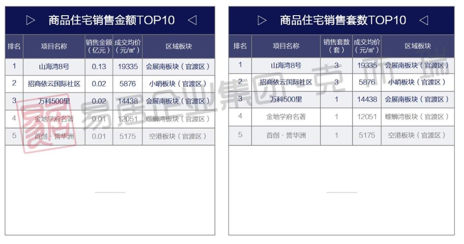 从“双榜”情况来看,受备案滞后影响,合计仅有5个项目上榜。其中,山海湾8号、招商依云国际社区、万科500里3 个项目位列前三,成交均价分别为19335元/㎡、5876元/㎡、14438元/㎡。金地学府名著、首创·誉华洲2个项目也榜上有名,均有1套房源成交。