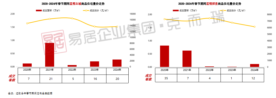 据克而瑞数据显示,整个春节假期,昆明主城成交20套、郊县成交12套,同比均呈现显著上升。价格方面则主城均价13688元/㎡,与2023年基本持平,下探空间有限;郊县均价6144元/㎡,且受制于配套、客户心理等因素,仍需以价换量。