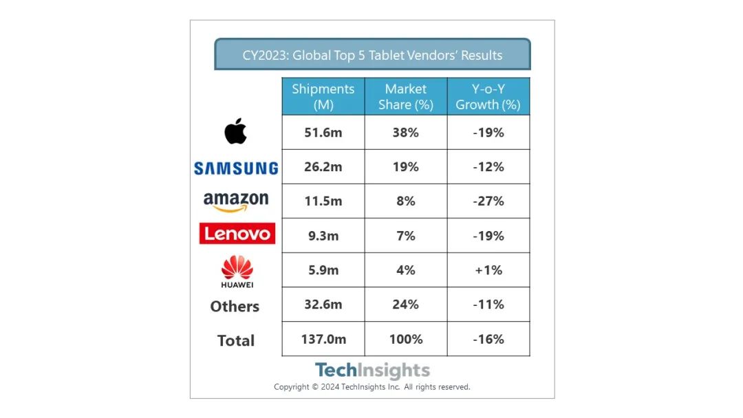 TechInsights公布的年度前五大平板电脑厂商分别为苹果、三星、亚马逊、联想和华为,对应的市场份额是38%、19%、8%、7%和4%。该机构称,与下半年相比,2023年上半年大多数市场的经济状况不佳,导致消费者支出在年底时更加强劲。