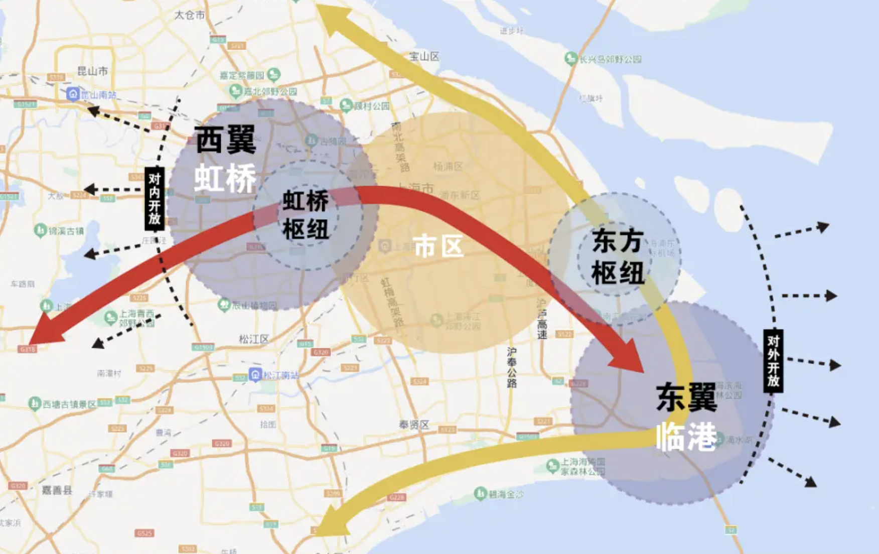 未来东方枢纽不仅是上海作为“全球城市的门户”,也是“长三角一体化的窗口”,是参与国内国际双循环的战略要点。东方枢纽将打造成世界级“临空经济+枢纽经济”示范区以及中国发展全球化的高地。