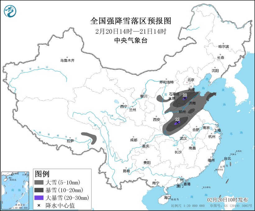 中央气象台2月20日10时发布暴雪黄色预警称,预计2月20日14时至2月21日14时,陕西北部、山西东南部、河北南部、山东、河南、安徽北部、湖北西部、西藏东部等地部分地区有大到暴雪,其中,河北南部、河南南部等地局地有大暴雪(20~22毫米)。上述部分地区新增积雪深度3~8厘米,局地可达12厘米以上。