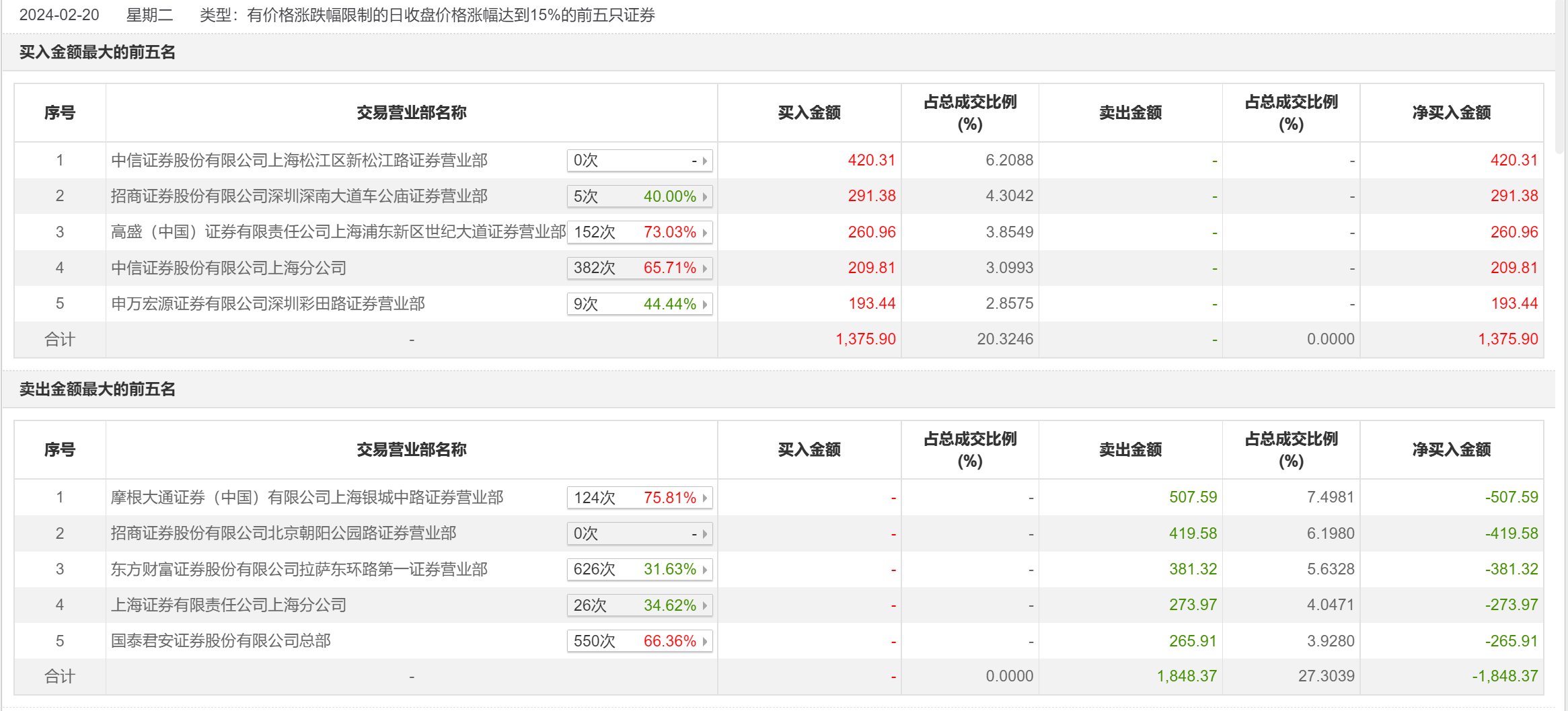 具体来看,中信证券上海松江区新松江路证券营业部、招商证券深圳深南大道车公庙证券营业部分别买入420.31万元、291.38万元;摩根大通上海银城中路证券营业部、招商证券北京朝阳公园路证券营业部分别卖出507.59万元、419.58万元。
