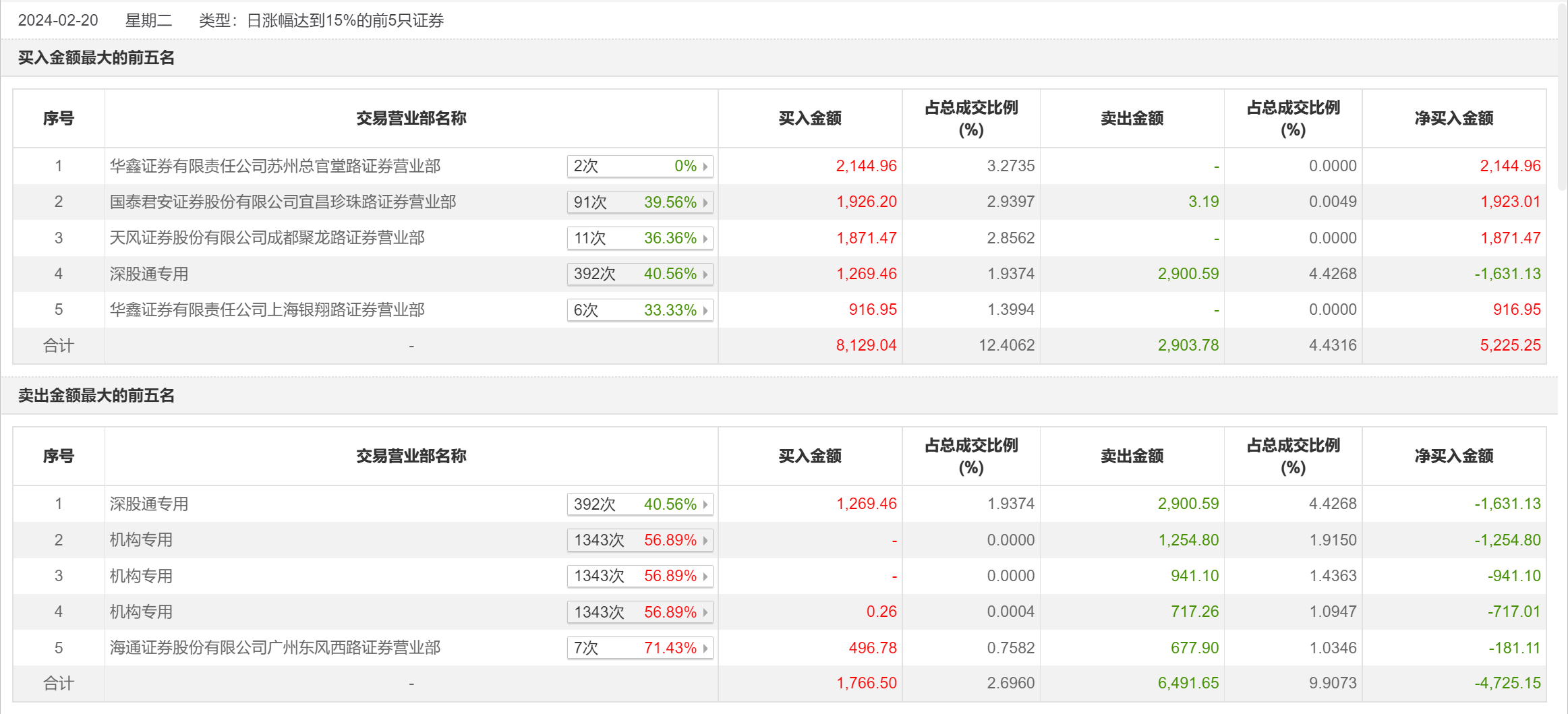 具体来看,机构买入2552元,卖出2913.16万元,合计净卖出2912.91万元。此外,华鑫证券苏州总官堂路证券营业部、国泰君安证券宜昌珍珠路证券营业部分别买入2144.96万元、1926.20万元;深股通专用、海通证券广州东风西路证券营业部分别卖出2900.59万元、677.90万元。