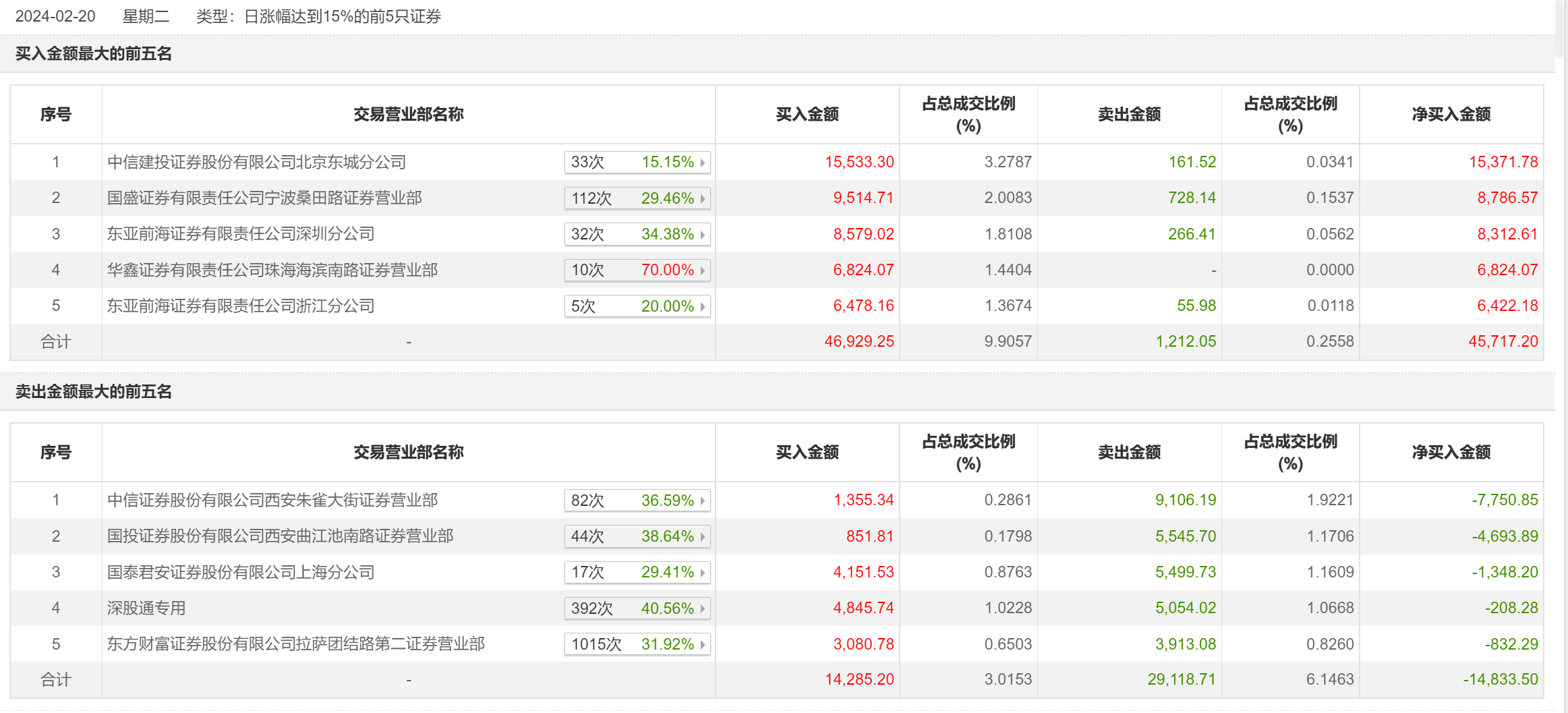 具体来看,知名游资现身龙虎榜,中信建投证券北京东城分公司、宁波桑田路(国盛证券宁波桑田路证券营业部)分别买入1.55亿元、9514.71万元;方新侠(中信证券西安朱雀大街证券营业部)、国投证券西安曲江池南路证券营业部分别卖出9106.19万元、5545.70万元。