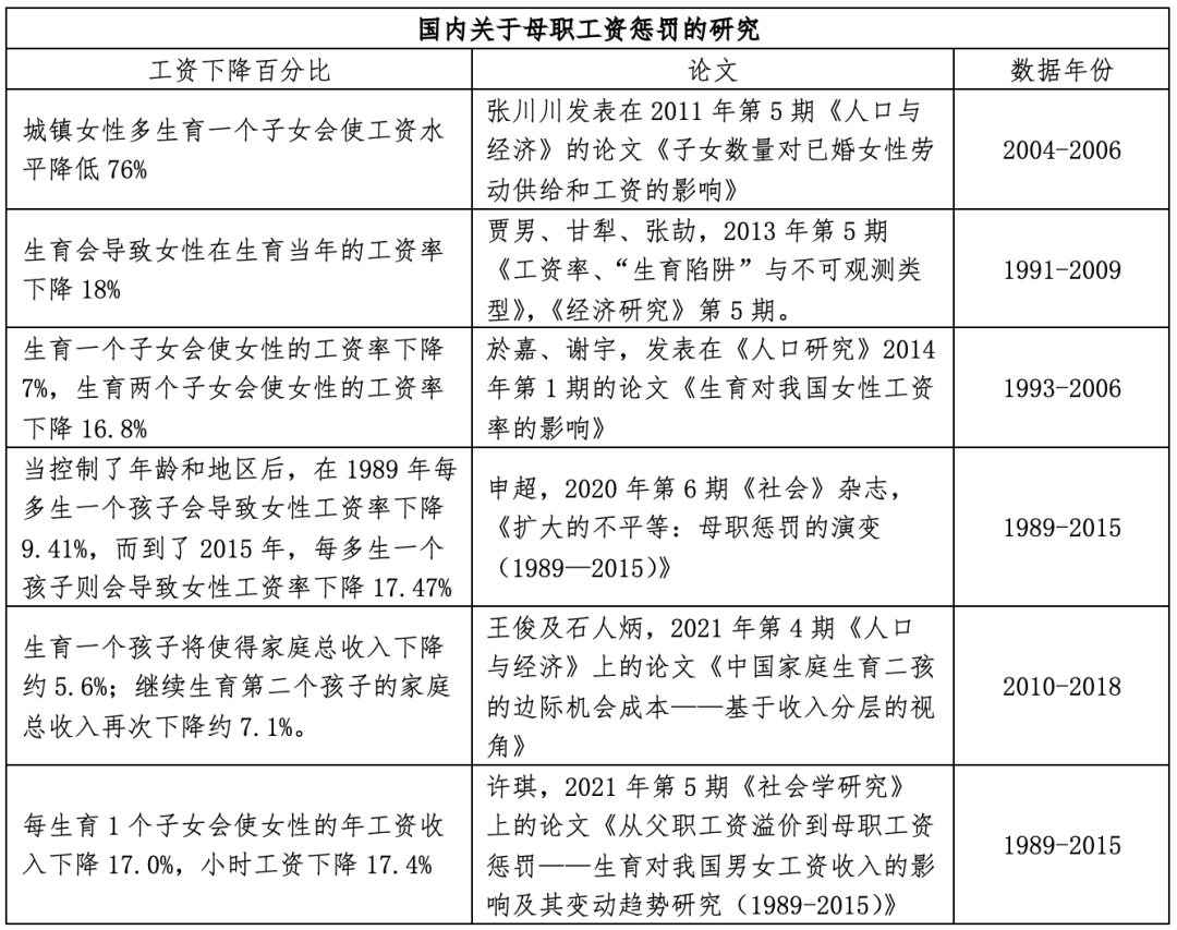 该报告综合多篇论文的研究数据得出,在中国,每生一个孩子会导致女性工资率下降12%-17%。女性工资率下降的具体幅度,也依据子女数量、子女年龄、所在工作部门的性质、年份数据等而有所不同。