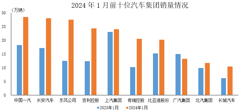 2月22日,据中国汽车工业协会统计分析,2024年1月,汽车销量排名前十位的企业(集团)共销售208.2万辆,占汽车销售总量的85.3%。在上述十家企业中,与上年同期相比,除广汽集团销量下降外,其他企业销量均呈不同程度增长,其中东风公司和奇瑞控股增速更为明显。