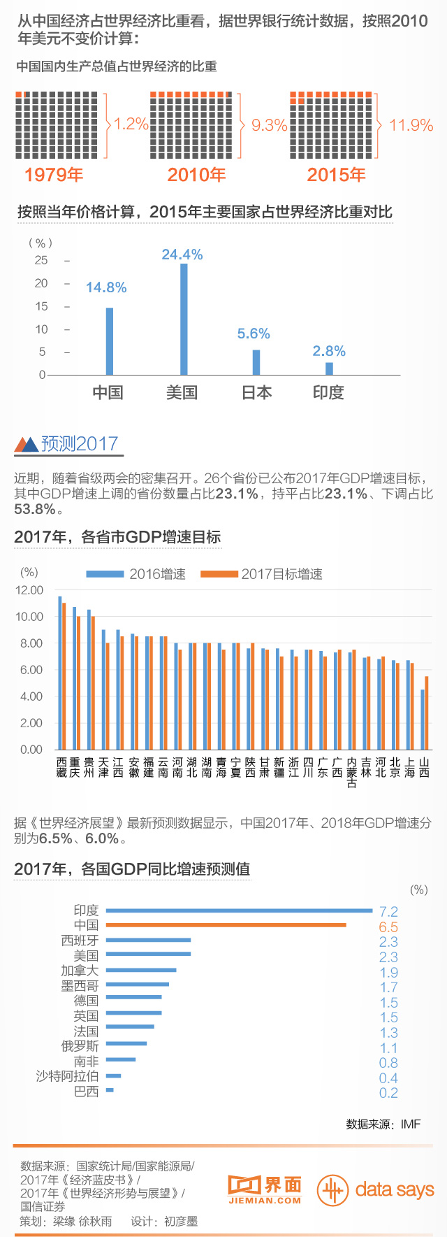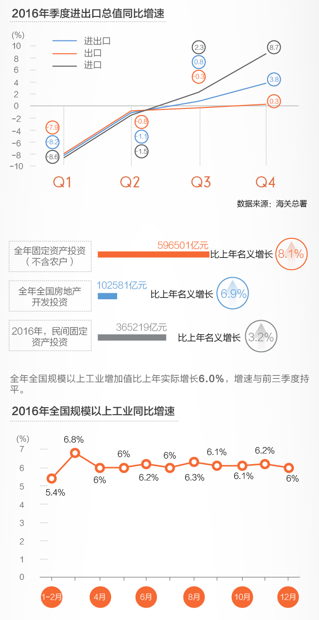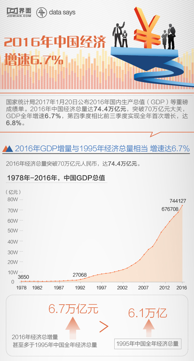 国家统计局2017年1月20日公布2016年国内生产总值等重磅成绩单。2016年中国经济总量达74.4万亿元,突破70万亿元大关,GDP全年增速6.7%,第四季度相比前三季度实现全年首次增长,达6.8%。