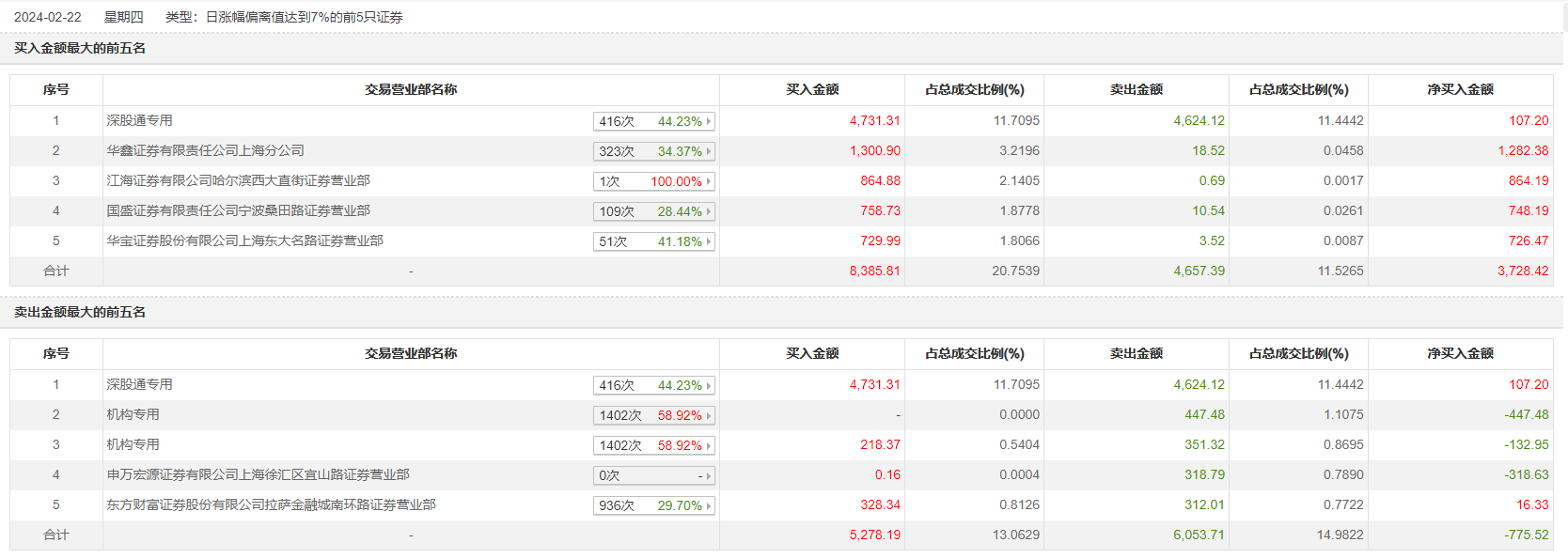 2月22日,华映科技今日涨停,龙虎榜数据显示,上榜营业部席位全天成交1.5亿元,占当日总成交金额比例为37.17%。其中,买入金额为8932.69万元,卖出金额为6086.99万元,合计净买入2845.7万元。