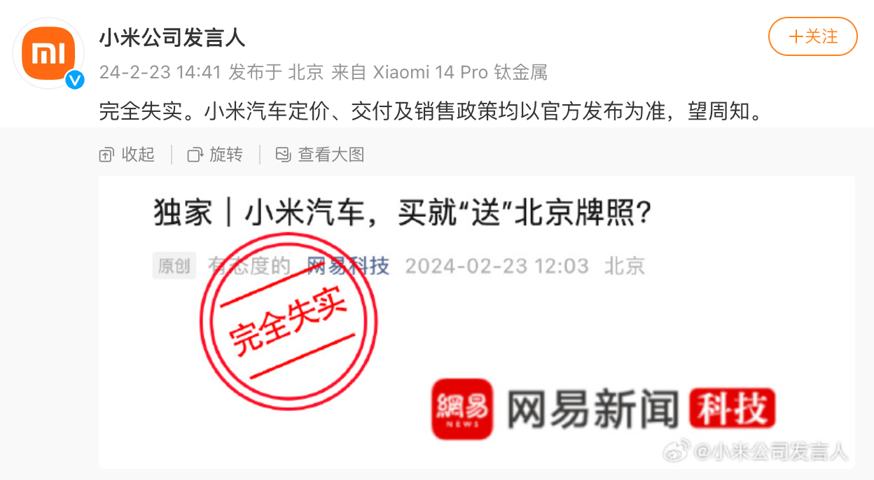 2月23日,据报道,有接近雷军的小米前期员工透露称,“雷军正在憋大招,首批购买小米汽车的车主,如果没有北京牌照,可能会赠送牌照。”对此,@小米公司发言人 发文回应称,完全失实。小米汽车定价、交付及销售政策均以官方发布为准。