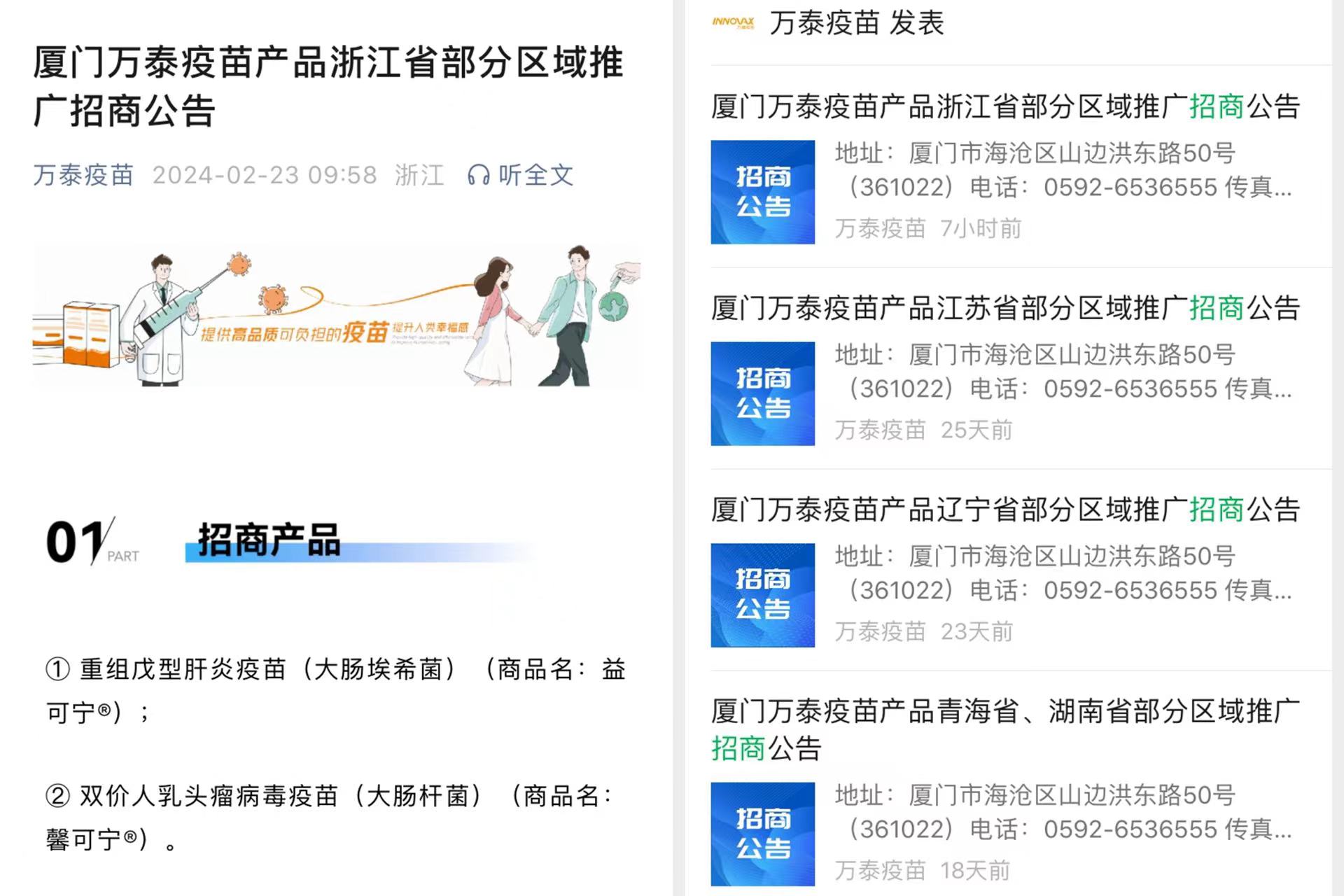 2月23日,万泰疫苗公众号发布厦门万泰疫苗产品浙江省部分区域推广招商公告。