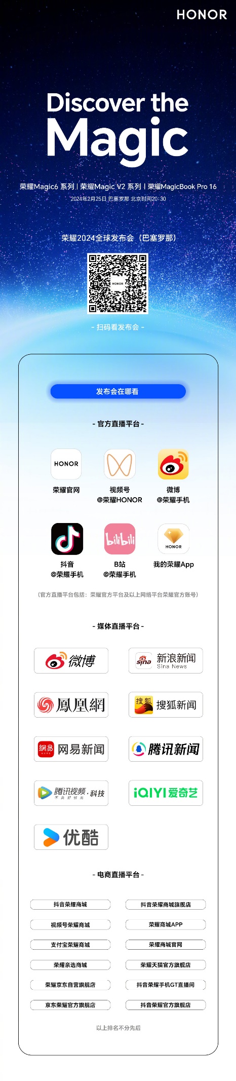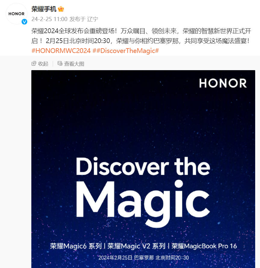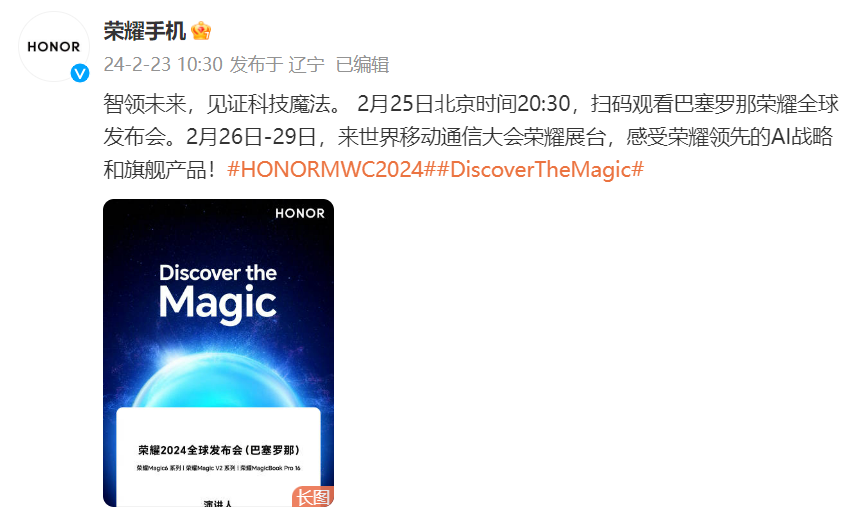 2月23日,荣耀手机官方发布了MWC2024荣耀全球发布会的海报,邀请大家于2月25日北京时间20:30,共同锁定荣耀2024全球发布会(巴塞罗那)一起见证荣耀AI战略,探索魔法科技。
