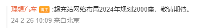 2月26日,理想汽车官方微博回复评论时表示,超充站网络布局2024年规划2000座。