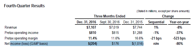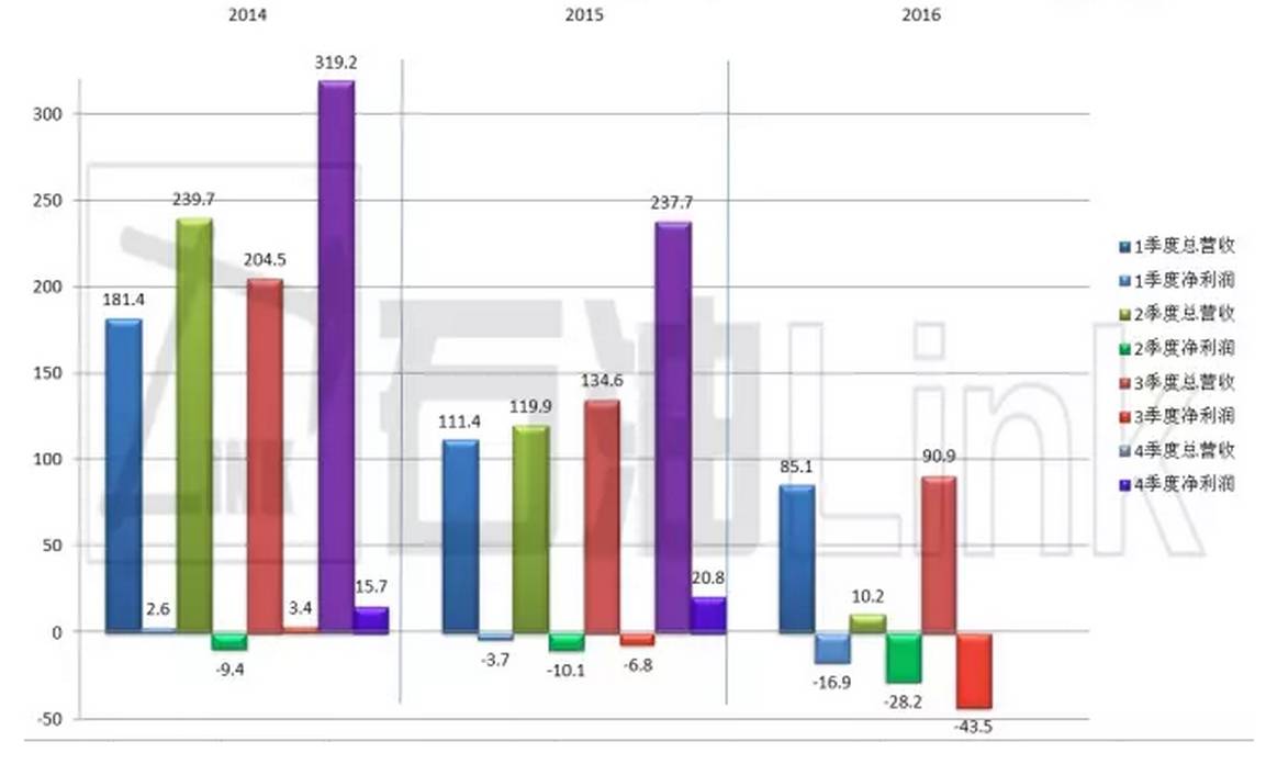 其中2016年第四季度营收为71.07亿美元;亏损2.04美元,约合人民币13.8亿。前三季度净利润依次分别为5.01亿美元、-21.6亿美元和1.76亿美元。相比2015年第四季度亏损10.16亿美元相比,亏损下降近80%,也算是可以振奋一下人心。