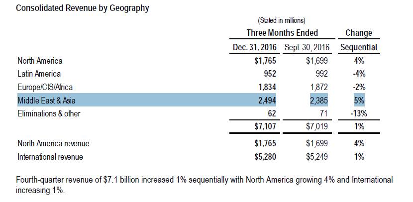 从斯伦贝谢全球业务来看,2016年第四季度中东及亚太地区和北美地区表现良好,营收分别为24.94亿美元和17.65亿美元,环比上涨分别为5%和4%,成为财报中的亮点。