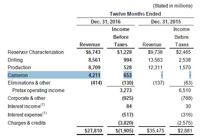 斯伦贝谢2016年最精彩的动作应该是完成对卡梅隆的收购,2016年度卡梅隆在营收上贡献了42亿美元,如果除去卡梅隆,斯伦贝谢2016年的营收下滑幅度将达到34%。