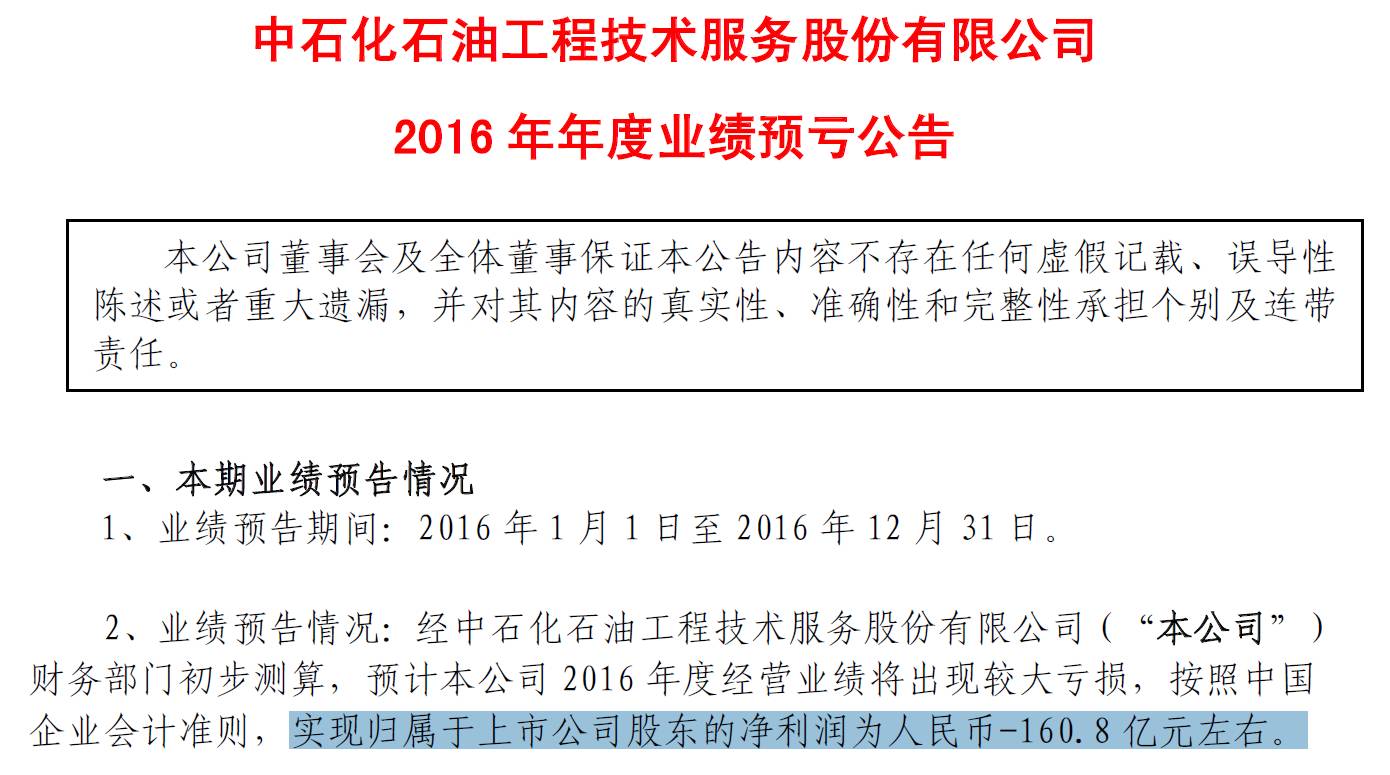 1月21日,石化油服发布2016年年度业绩预亏公告,预计亏损大约160.8亿。此前一至三季度石化油服分别亏损16.9亿元、28.2亿元、43.5亿元,但最终全年预计亏损约160.8亿元仍令人有点意外。