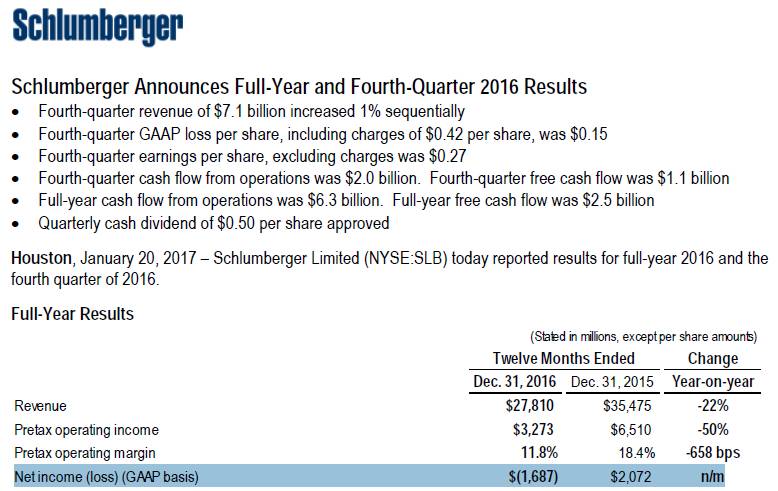 当地时间1月20日,作为全球油服行业的NO.1斯伦贝谢交出了2016年4季度及全年成绩单。