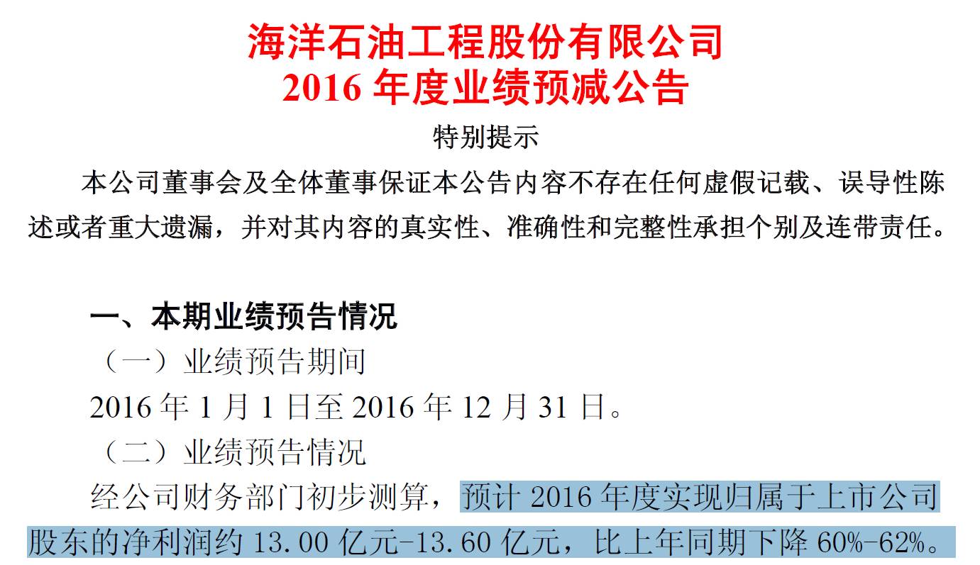 其中,海油工程预计2016年度实现归属于上市公司股东的净利润约13.00亿元-13.60亿元,比上年同期下降60%-62%。