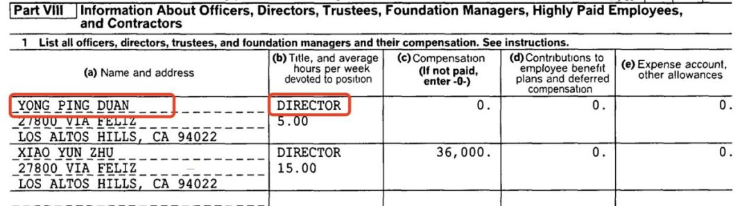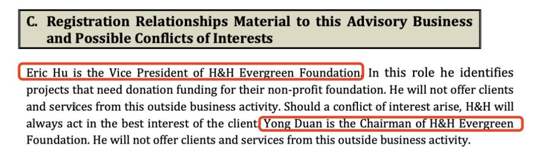 SEC另有一份文件中有信息提到,Yong Duan和Eric Hu还管理着一家名叫H&H Evergreen Foundation的基金。追溯这只基金早年前的一张表格,赫然出现YongPing Duan,为该基金的董事。