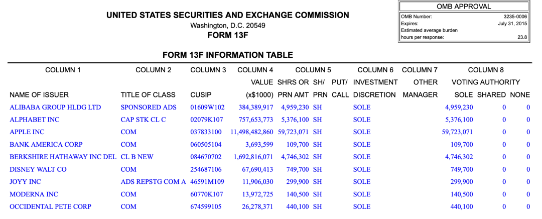 目前,H&H持有9家上市公司的股票,持仓为115亿美元的苹果、17亿美元伯克希尔·哈撒韦、7.57亿美元的谷歌、3.84亿美元的阿里巴巴,此外还持有迪士尼、西方石油、Moderna、欢聚时代和美国银行。
