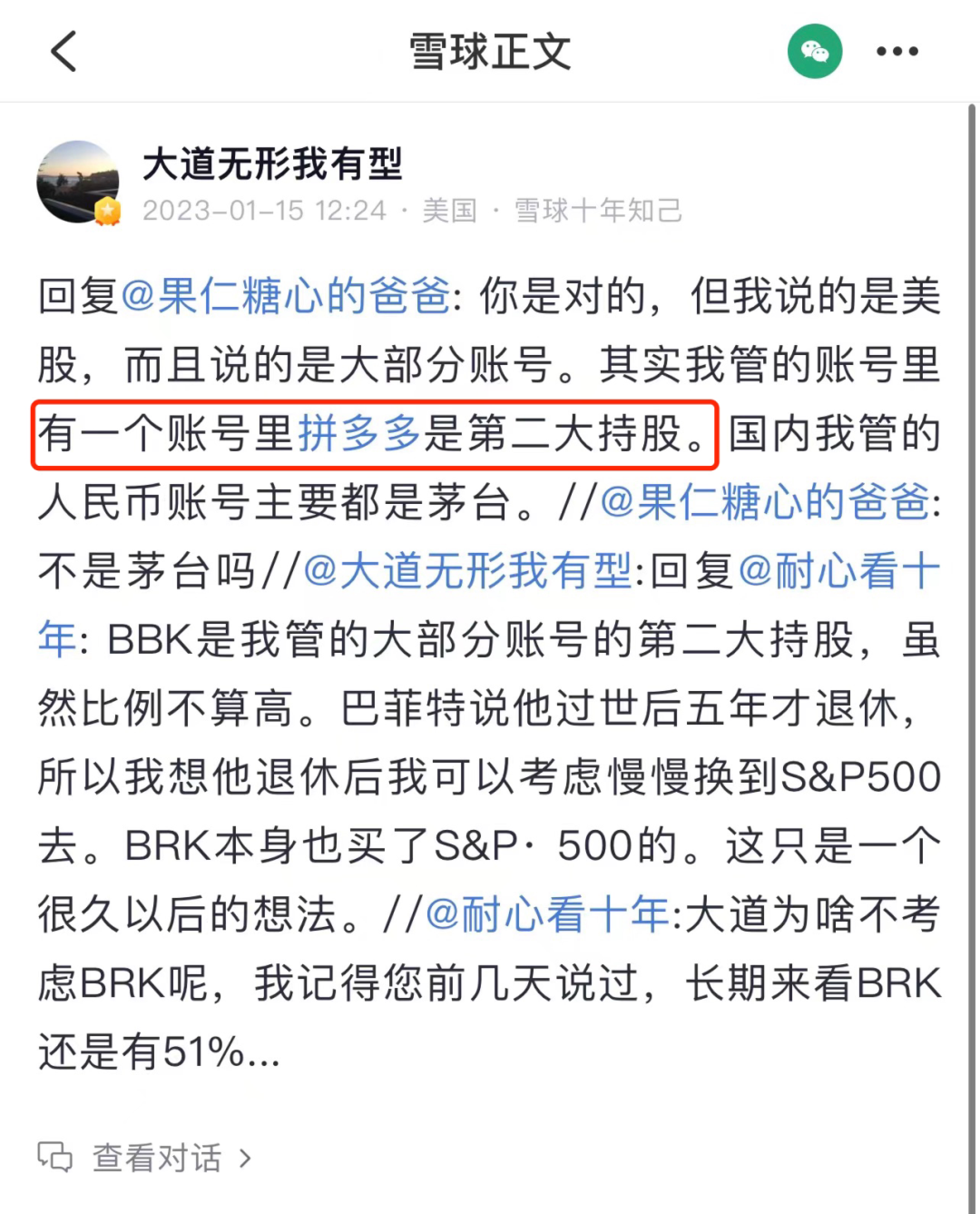 虽然H&H第四季度清仓了拼多多,但这只是段永平持有的账户之一。他曾在去年回复网友表示:“其实我管的账号里有一个账号里拼多多是第二大持股。”