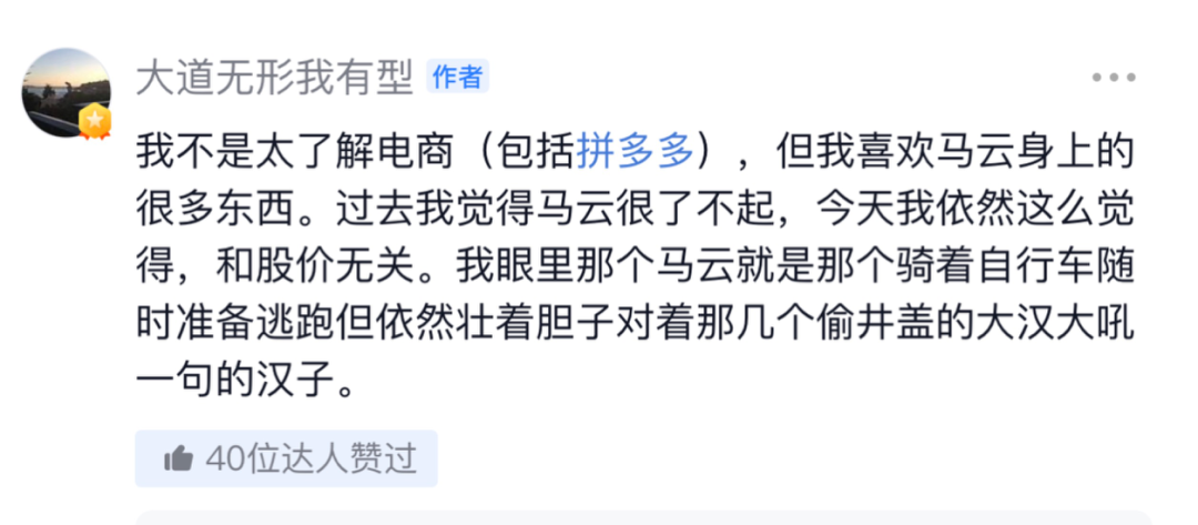 随后他自己在这篇推文下补充,“我不是太了解电商(包括拼多多),但我喜欢马云身上的很多东西。过去我觉得马云很了不起,今天我依然这么觉得,和股价无关。我眼里那个马云就是那个骑着自行车随时准备逃跑但依然壮着胆子对着那几个偷井盖的大汉大吼一句的汉子。”