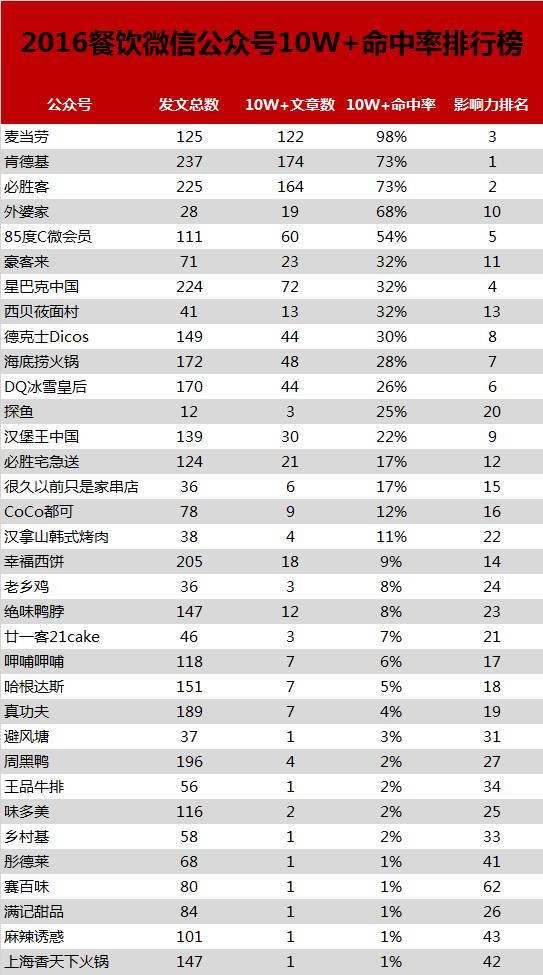 ▲ 上榜的餐饮微信号一年贡献了9百多篇10W+文章。在这个“10W+命中率”的排名上,位于榜首的麦当劳10W+命中率高达98%。