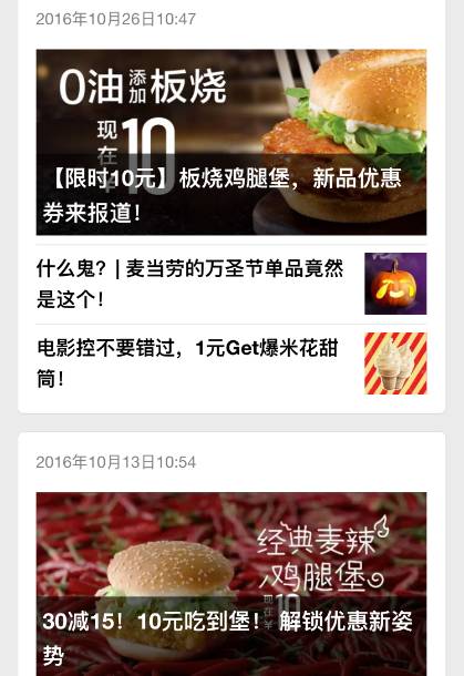 打开麦当劳10W+文章的标题列表,公会君发现麦当劳喜欢用数字说话。“10元吃到堡”、“5元福利”、“3元酸奶甜筒”、“30减15”、“买一送一”、“第二个半价”、这些字样都会明明白白地出现在标题中,这也恰恰是最能够吸引消费者注意的元素。再配上“限时”、“限量”这些让人感到紧迫的词语,比起空吆喝,效果棒多啦。