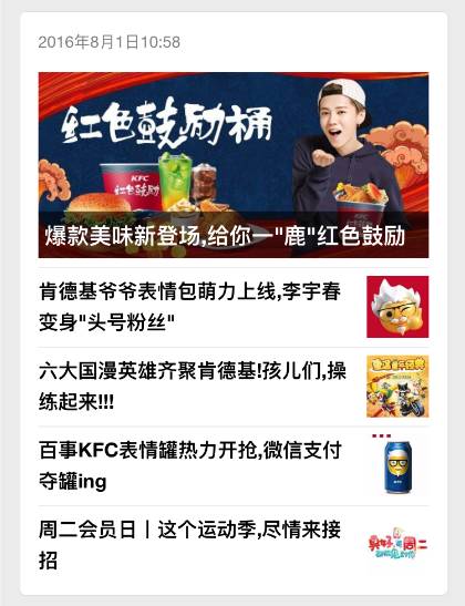 肯德基走的是年轻潮流路线,会借“上海时装周”、“毕业季”等话题做促销活动。此外2016年肯德基也请了很多明星外援,来调动广大粉丝、“迷妹”的热情。在公众号文章中出现的有SNH48、鹿晗、李宇春、熊黛林等。